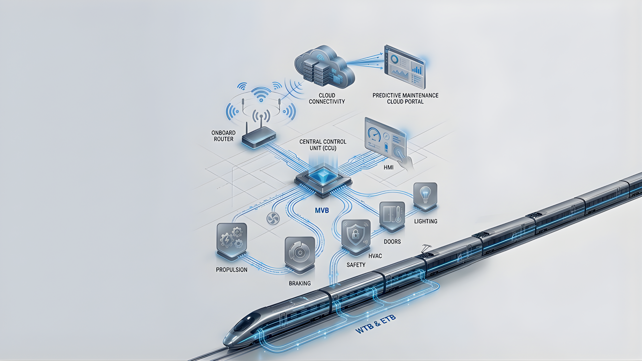 The TCMS portfolio includes system components such as remote I/O units, power supplies, gateways, and diagnostic tools that enable communication and monitoring across train systems.